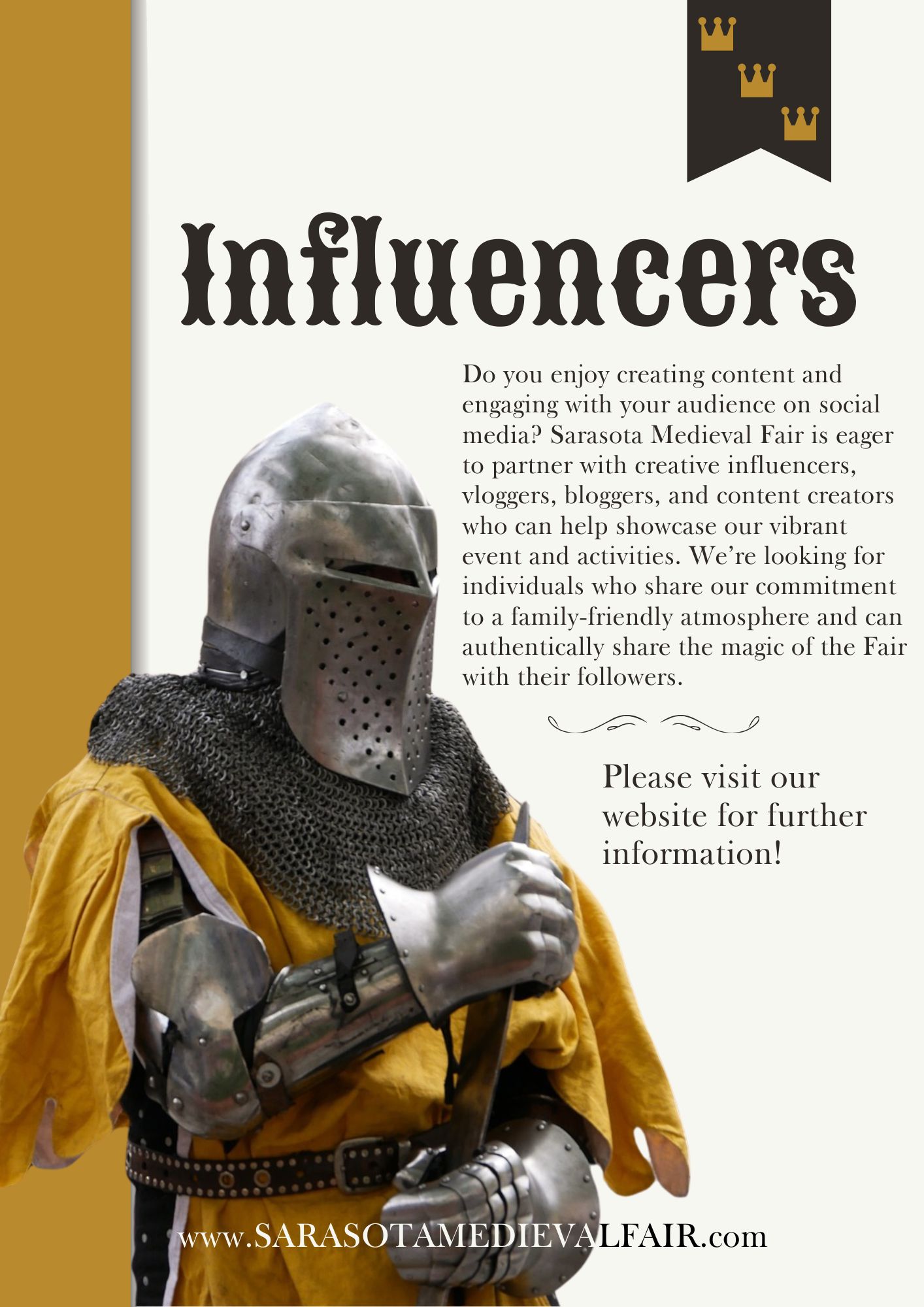 Do you enjoy creating content and engaging with your audience on social media? Sarasota Medieval Fair is eager to partner with creative influencers, vloggers, bloggers, and content creators who can help showcase our vibrant event and activities. We're looking for individuals who share our commitment to a family-friendly amosphere and can authentically share the magic of the Fair with their followers.